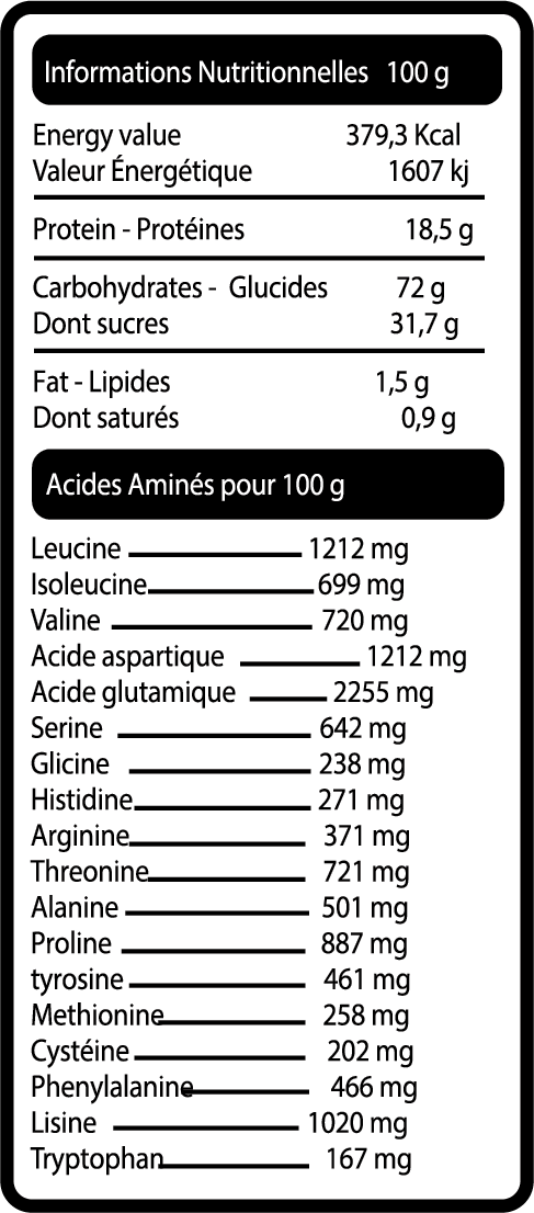 - Peut être utilisé comme complément post-entraînement ou boisson journalière pour répondre aux besoins caloriques.